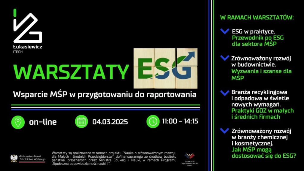 4 marca 2025 r. – Sieć Badawcza Łukasiewicz – ITECH Instytut Innowacji i Technologii zorganizowała ogólnopolskie warsztaty online pt. „Wsparcie MŚP w przygotowaniu do raportowania ESG”. Celem wydarzenia było dostarczenie małym i średnim przedsiębiorstwom niezbędnej wiedzy oraz praktycznych wskazówek dotyczących raportowania w obszarze zrównoważonej transformacji.